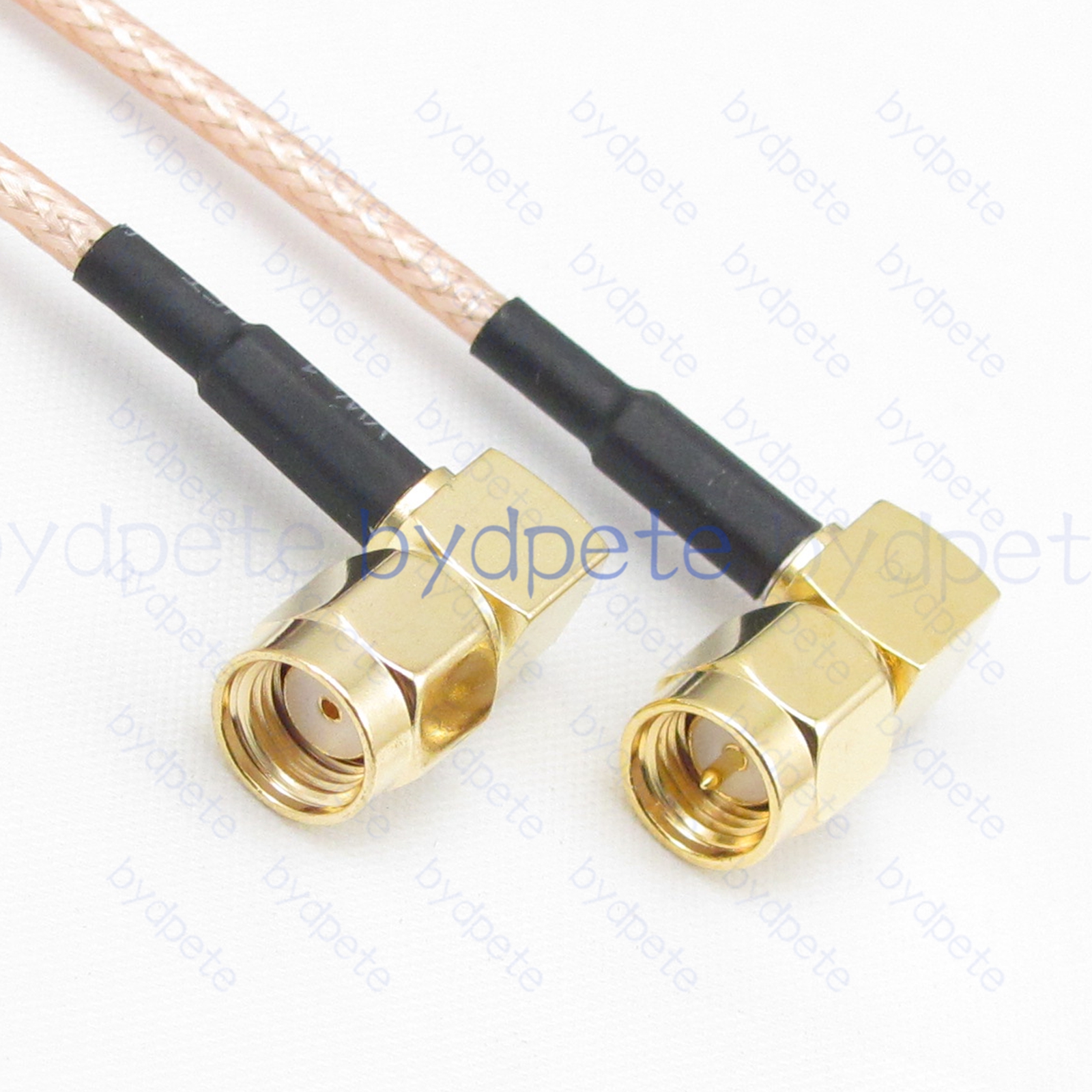 * Connector A : SMA male Right Angle 90Degree plug ( inside is thread and center is needle male pin ) * Connector B : RPSMA male Right Angle 90Degree Reverse Polarity plug ( inside is thread and center is hole female pin ) * Cable Type : RG316 Light Brown FEP Jacket ( White PTFE Insulation ) Coax Cable Low Loss ( center wires 7x0.175mm silver-plated , shield wires 80x0.1mm silver-plated ), outside diameter OD=2.5mm * Cable Length : Customized by buyer. ( If you want other length, please leave a message in the order or Contact us. ).