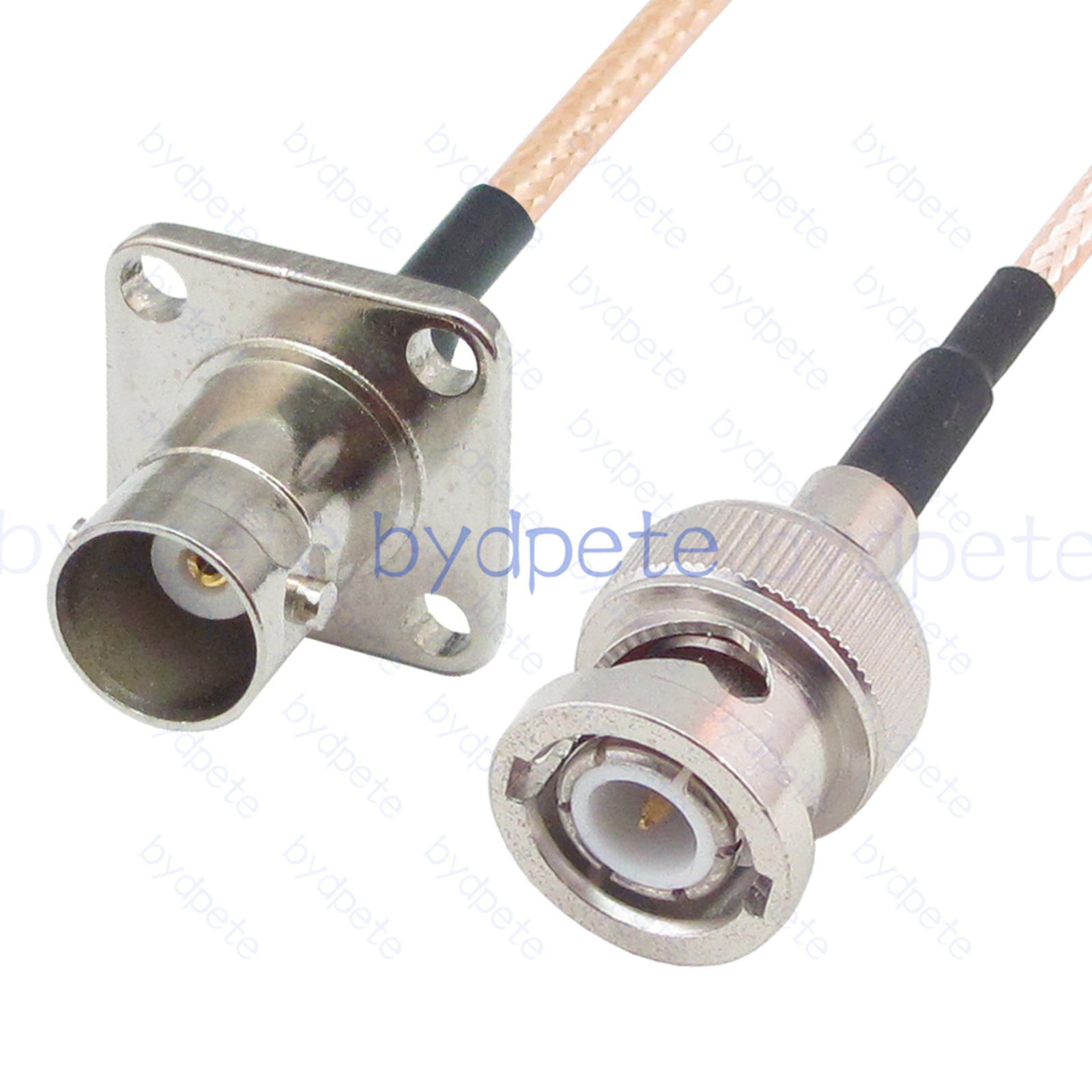 * Connector A : BNC male plug ( inside is thread and center is needle male pin ) * Connector B : BNC female 4holes panel jack ( outside is thread and center is hole female pin ) * Cable Type : RG316 Light Brown FEP Jacket ( White PTFE Insulation ) Coax Cable Low Loss ( center wires 7x0.175mm silver-plated , shield wires 80x0.1mm silver-plated ), outside diameter OD=2.5mm * Cable Length : Customized by buyer. ( If you want other length, please leave a message in the order or Contact us. ).