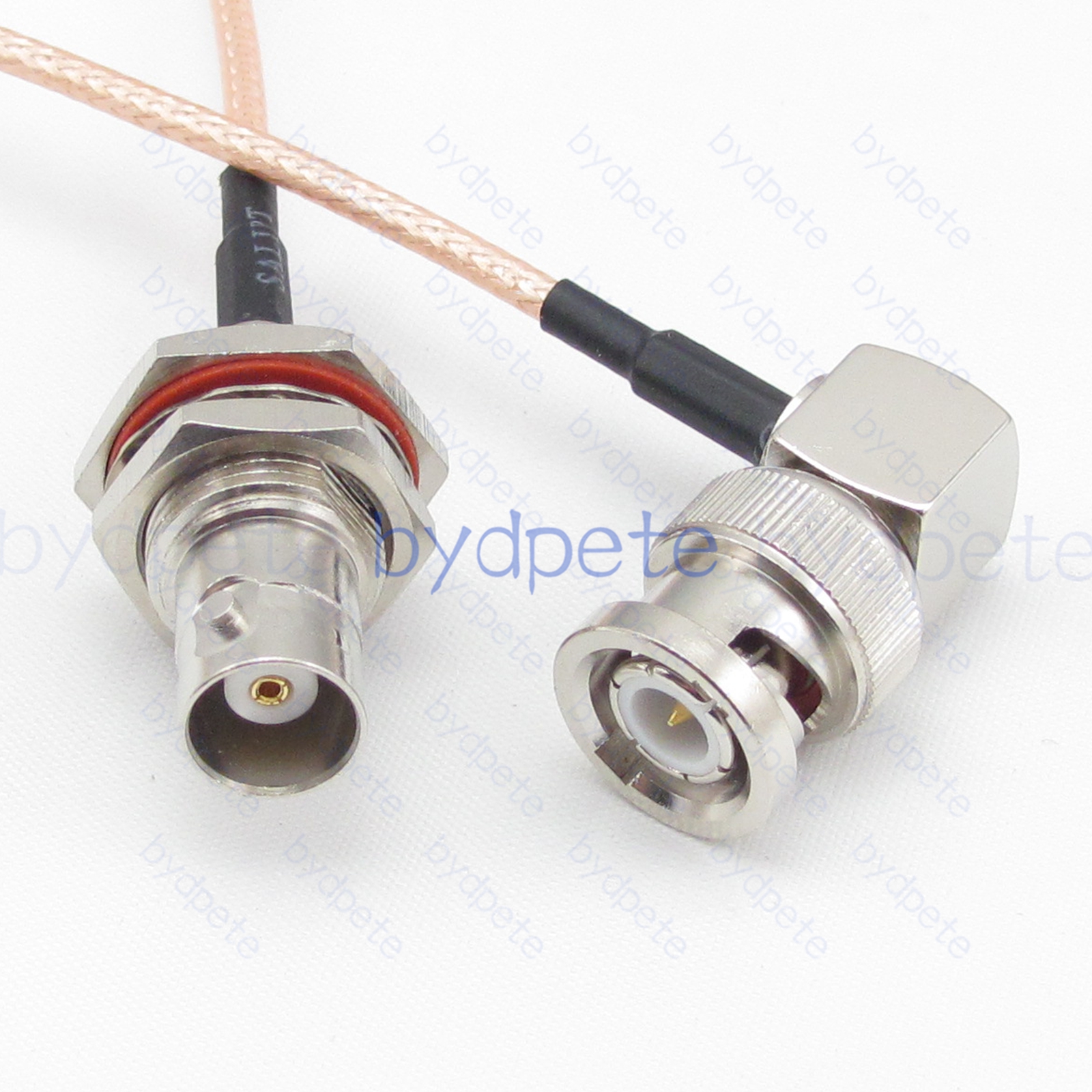 * Connector A : BNC male Right Angle 90Degree plug ( inside is thread and center is needle male pin ) * Connector B : BNC female Bulkhead Waterproof jack ( outside is thread and center is hole female pin ) * Cable Type : RG316 Light Brown FEP Jacket ( White PTFE Insulation ) Coax Cable Low Loss ( center wires 7x0.175mm silver-plated , shield wires 80x0.1mm silver-plated ), outside diameter OD=2.5mm * Cable Length : Customized by buyer. ( If you want other length, please leave a message in the order or Contact us. ).